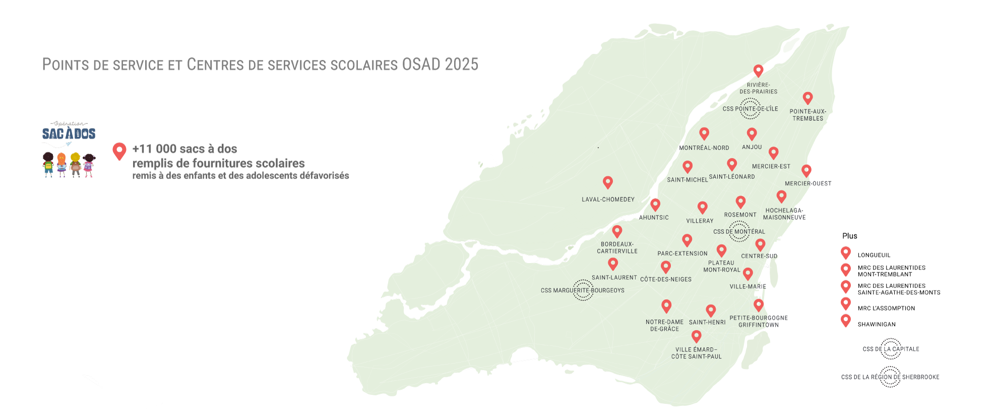 L’Opération Sac à Dos est une initiative du Regroupement Partage qui se déroule chaque année. Son objectif principal est de venir en aide aux enfants issus de familles économiquement fragiles en leur fournissant des sacs à dos, des boîtes à lunch et des fournitures scolaires. Les enfants ont la possibilité de choisir un sac à dos à leur goût parmi une variété de modèles, de couleurs et de motifs. Cette implication des enfants dans le choix de leurs effets scolaires leur permet de développer le sentiment de confiance dont ils ont besoin pour réussir leur rentrée scolaire.